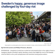 På USA:s motsvarighet till Sveriges radio, NPR, beskrivs Sverige som ett av världens rikaste, mest stabila och problemfria länder, ett land som ”beundrats av världen i åratal”, men med rubriken ”Riots in Sweden. That’s right. Sweden”, menar NPR.org att Sverige genomgår självrannsakan i ljuset av upploppen i Stockholms förorter.