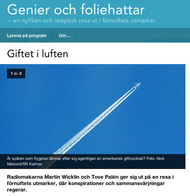 Martin Wicklin och Tove Palén från Tredjestatsmakten.se har gjort en programserie till Sveriges Radio P1 ”Genier & foliehattar –en resa i förnuftets utmarker, där konspirationer och sammansvärjningar regerar” ett av fyra avsnitt sänt i skrivande stund, ”Giftet i luften”.